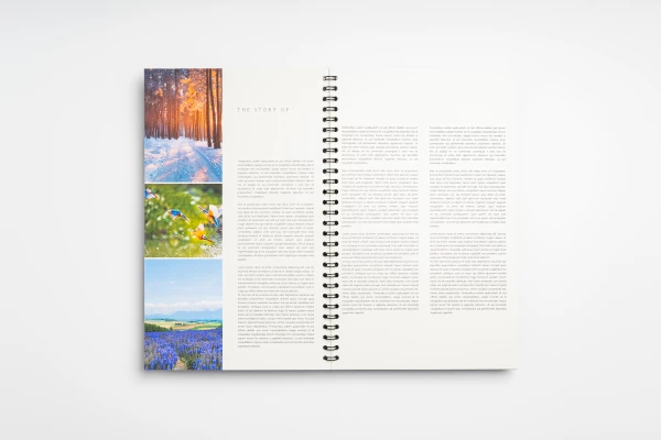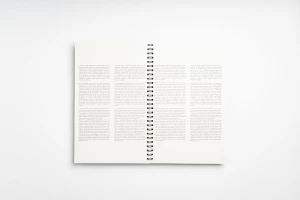 156.5x246.5mm, in color, printed on both sides on 120 grams rustic (warm white) paper, wire-o binding on long side, printed on front (very sturdy), back endpaper white, metal ring binder (black)