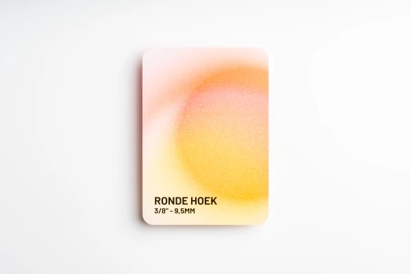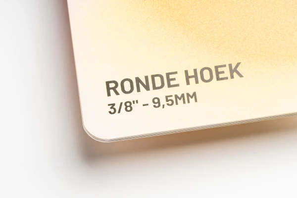 De ronde hoeken die worden gecreëerd op jouw ontwerp worden handmatig gestanst. Dit betekent dat er een gedeelte van jouw oorspronkelijke hoek wordt weggesneden. Maar hoeveel is dat nu eigenlijk? De radius van de weggesneden hoek is 3/8" - 9,5mm, hier dien je dus rekening mee te houden tijdens het maken of bestellen van je ontwerp.
