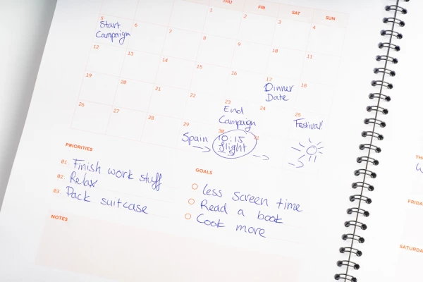 Bij Print&Bind kun je jouw planner personaliseren met verschillende afwerkingsmogelijkheden. Kies uit een spiraal- of lijmrug, afhankelijk van je voorkeur voor flexibiliteit of een strakke uitstraling. Voor de omslag kun je kiezen uit stevige materialen en toplagen zoals glanzend of mat laminaat, wat extra bescherming biedt en een luxe uitstraling geeft. Zo maak je jouw planner niet alleen functioneel, maar ook een stijlvolle aanvulling op je dagelijkse leven!