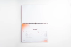A4 size, 8 pages in color, single-sided printed on 250 gsm paper, wire-o binding on the long side, printed front cover (extra sturdy), back cover (single-sided printed) with white divider sheet, metal ring binding (black), equipped with a calendar hook