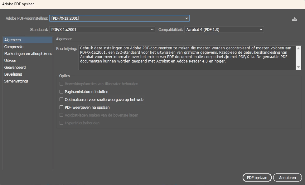 As the final step, save your file in the PDF/X-1a:2001 format. This ensures that the spot colors and settings are correctly exported. By doing so, we can accurately read your contour line and produce your order with precision.