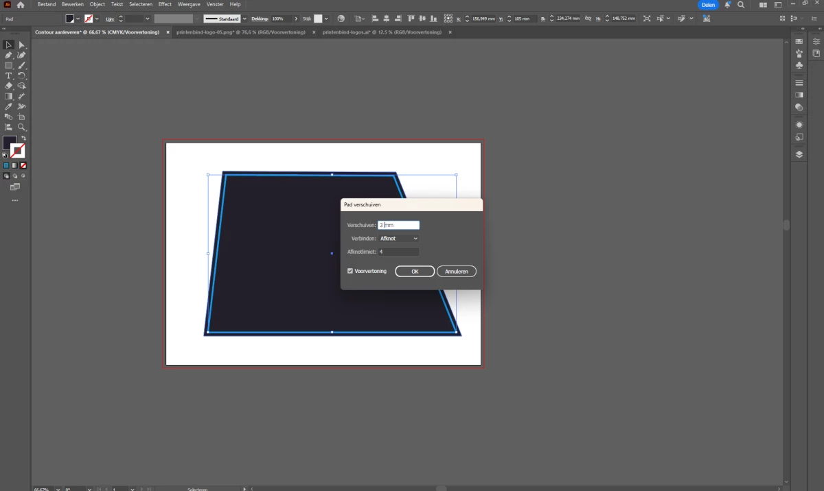 To create the bleed, we will apply an offset in Illustrator. Select the shape you previously drew and shift it by a small amount (offset path), usually 3mm, so that the color of the shape extends beyond the cut line. This ensures that your design will print without white edges, even if there are slight variances during the cutting process.