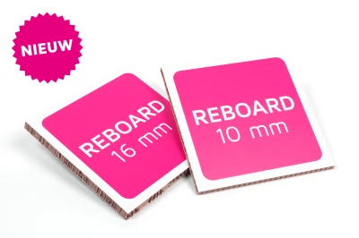 Reboard is voorzien van een witte toplaag aan beide zijden. Hierdoor kan het plaatmateriaal dubbelzijdig worden bedrukt. Door de honingraat structuur aan de binnenkant is het bord super sterk en tegelijkertijd super licht! Je kunt re-board bestelling in 10 of 16 mm dik. Het is dus een stuk dikker dan onze andere plaatmaterialen.