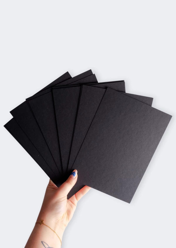 Het volledige papier is door en door gekleurd in de diepzwarte tint, waardoor het op elk formaat optimaal tot zijn recht komt zonder witte zijden. Bovendien is het papier behandeld om geen vlekken af te geven of door te bloeden op het binnenwerk van de boeken.