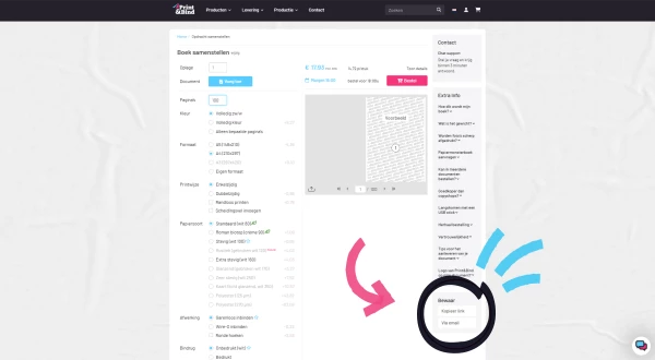 Ben je nog bezig met je document, maar wil je, bijvoorbeeld, alvast een prijsindicatie of onze opties verkennen? Voer dan eenvoudig je bestelspecificaties in ons systeem in. Ook later kun je dit nog gemakkelijk terug vinden!